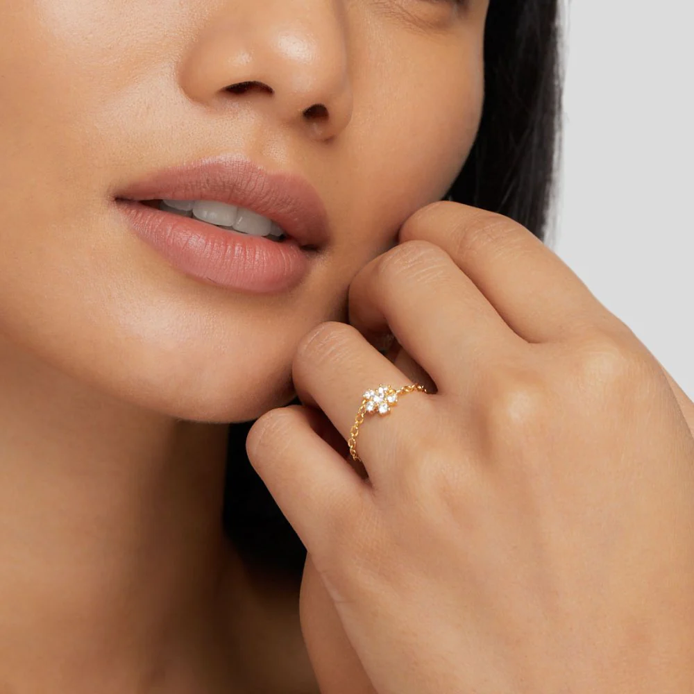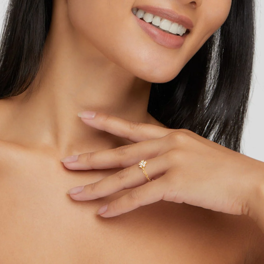 This charming ring features a delicate crystal daisy chain design, capturing the essence of a blooming garden in a piece of jewelry.
